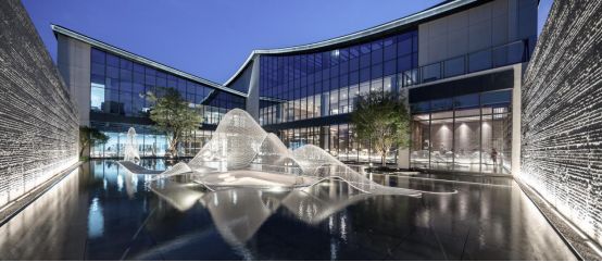山水形象,现代书院。界面宛如书院的院墙环抱,仿佛是将一切与文化无关的气息都隔绝在外。内部庭院错落,或大开大合,或内敛幽静,流水般的动线,开放自如,生动活跃。